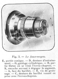 Le faux-moyeu porte en c1 une partie conique servant de butée au moyeu. Celui-ci est maintenu en place par l’écrou qui se visse sur la partie filetée du faux-moyeu, et presse énergiquement le moyeu par la surface conique ce moyeu, serré entre les deux cônes c, et ci est parfaitement maintenu et ne peut prendre aucun jeu.