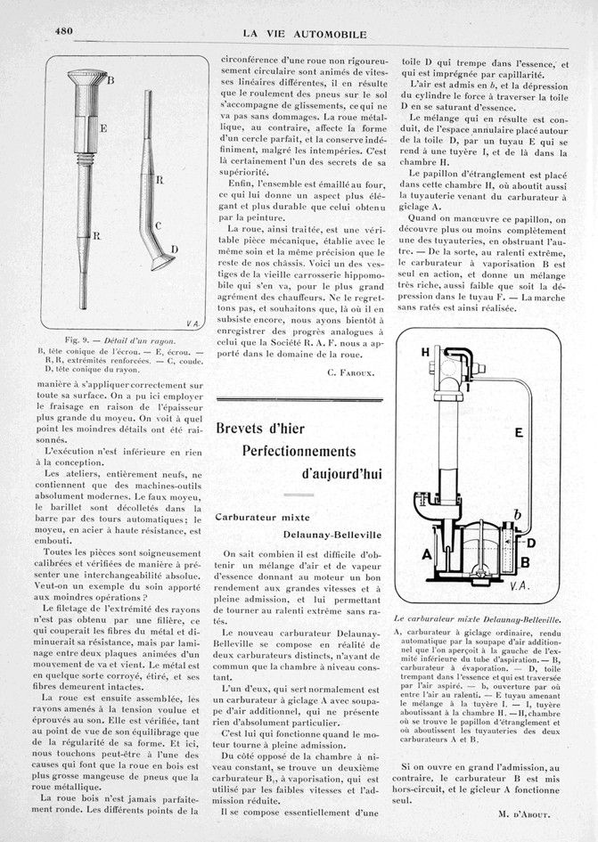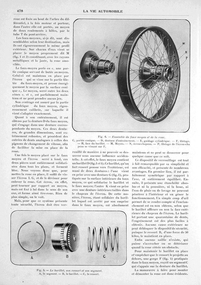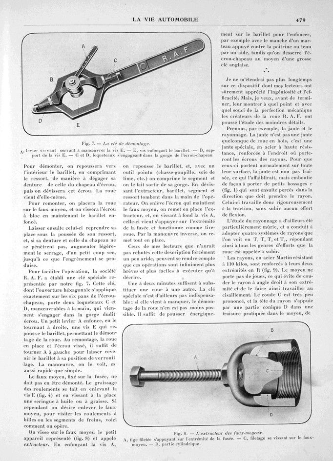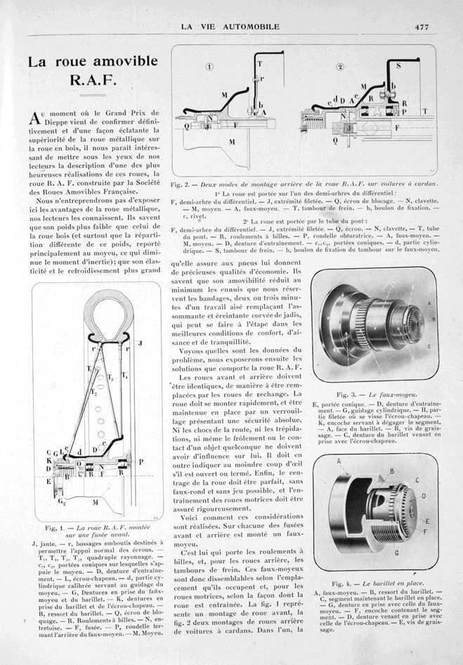Charles Faroux decribes in tis article, the most important specifics of the detachable, all steel wheel of R.A.F. Definicely not being the Britisch air force, the name stands for la Société des Roues Amovibles Francaise.; the Company for French detachable wheels. At the 1912 Grand Prix at Dieppe, these wheels had quite an influence on racing car speed and behaviour, compared to the then common wooden cannon wheels. Lower weight, faster acceleration and better braking, as well as lower tyre temperatures were the most significant characteristcs of these all-steel wheels.