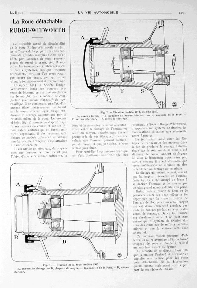 Le dispositif actuel de détachabilité de la roue Rudge-Whitworth a réuni les suffrages de la plupart des constructeurs de grandes marques : c’est qu’en effet, par l’absence de tous ressorts, pièces de sûreté à crans, etc., il supprime les inconvénients inhérents à ces différents systèmes, tels que : rupture de ressorts, intrusion d’un corps étranger, usure des crans, etc., qui empêchent le fonctionnement du verrouillage.
