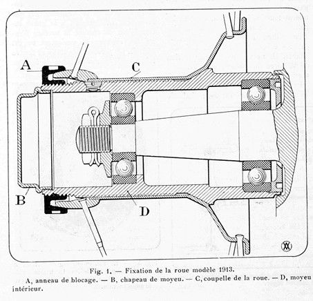 A, anneau de blocage. — B, chapeau de moyeu. — C, coupelle de la roue. — D, moyeu intérieur.