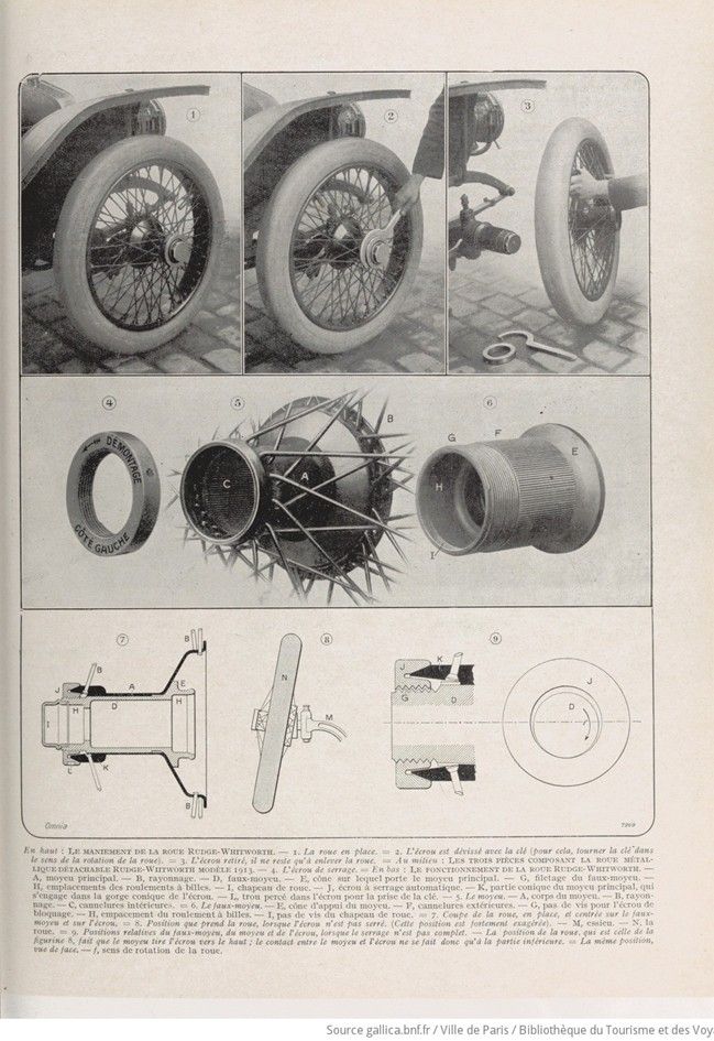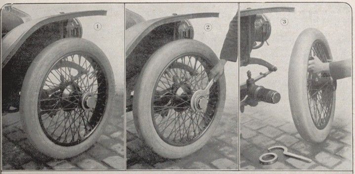 Top: HOW TO HANDLE THE RUDGE-WHITWORTH WHEEL. — 1. The wheel in place.— 2. The nut is unscrewed with the wrench (to do this, turn the wrench in the direction of the wheel’s rotation). = 3. Once the nut has been removed, all that remains is to remove the wheel.