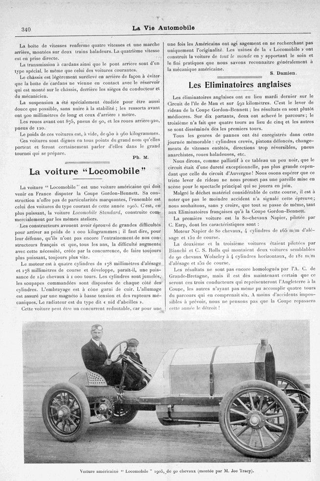 La voiture “ Locomobile” est une voiture américaine qui doit venir en France disputer la Coupe Gordon-Bennett. Sa construction n’offre pas de particularités marquantes, l’ensemble est celui des voitures du type courant de cette année 1905. C’est, en plus puissant, la voiture Locomobile Standard, construite commercialement par les mêmes ateliers.