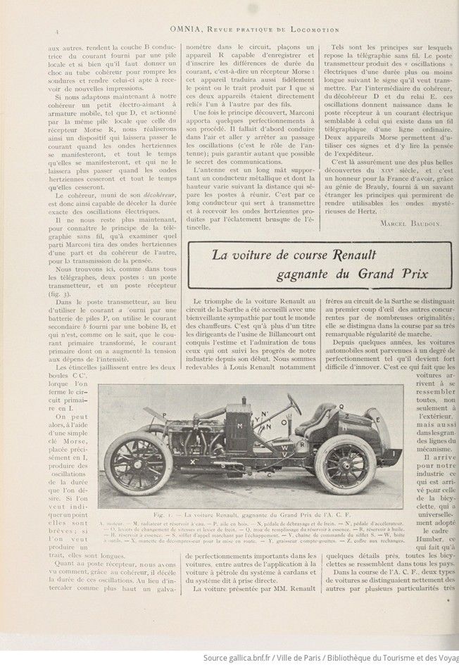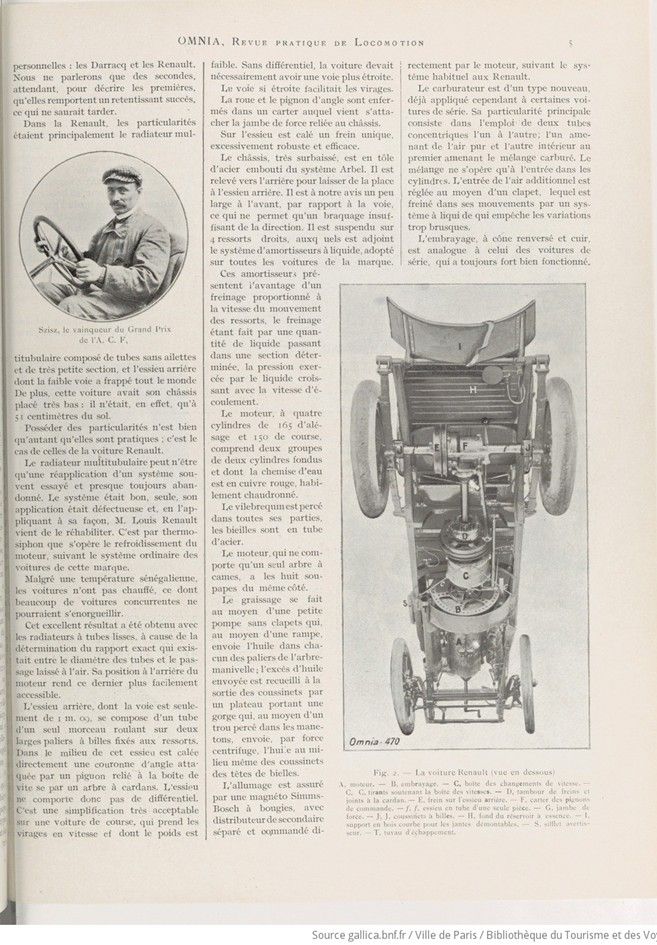 The car presented by Messrs. Renault brothers at the Sarthe circuit stood out from the other competitors at first glance thanks to its many original features; it distinguished itself in the race by its remarkable consistency.