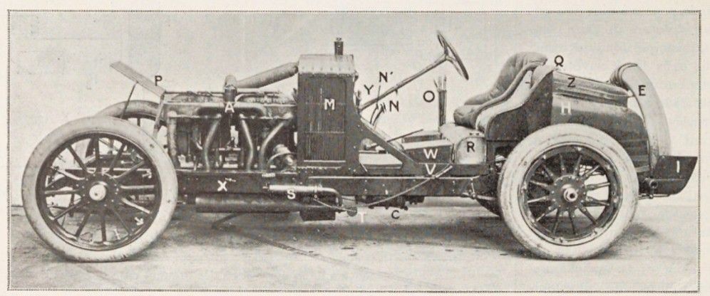A. Engine. — M, radiator and water tank. – P, wooden fender. – N, clutch and brake pedal. — N‘, accelerator pedal. — 0, gear shift levers and brake lever. — Q, fuel tank filler hole. — R, oil tank. — H. fuel tank. — S, whistle operated by the exhaust. — Y, whistle control chain S. – W, toolbox. — X, decompressor lever for starting. — Y, drip oil can. —. Z, spare parts box.