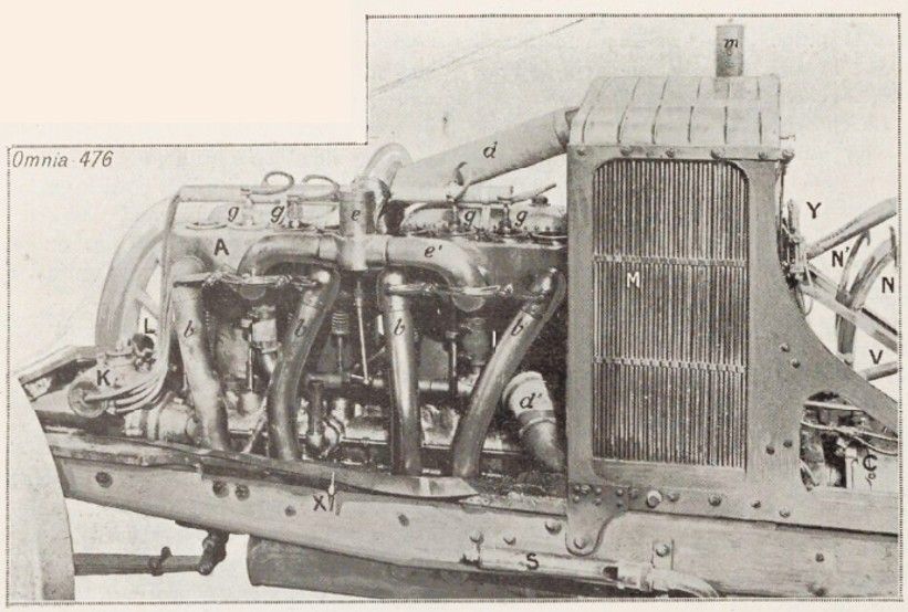 K, Secondary current distributor. — L, magneto. — A. engine assembly. — b, exhaust pipes. — dd‘, rubber water pipes. — e, choke on the intake, — g, spark plugs. — X. decompressor lever. — M, multi-tube radiator. — m, water tank cap. – S, whistle. — Y. Drip oiler. — X‘, accelerator pedal. — 1’\, clutch pedal and brake pedal. — N‘, reverse gear lever. — C. Gearbox.