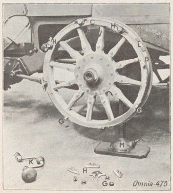 B. Rim or false rim. — C, wooden rim. — G. G. Bolts and nuts for securing the corners Il. — H. H. H. Corners. — K. Crankshaft used for quick removal of nuts G. — L. Location of the drive key. — M. Jack.