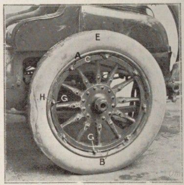 The wheel with a removable rim, used on Renault cars for the rear, consists of a hub of the known artillery system, spokes, and a wooden rim. A steel circle is placed on this rim, forming a band. This band is perfectly round and flat. Towards the inside of the wheel, it is equipped with a kind of bead similar to that used on railway carriage wheels.