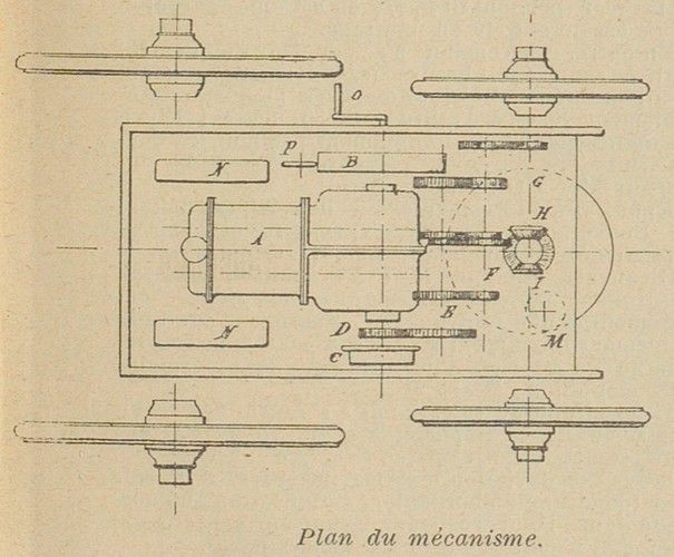 The engine A, which appears to be ordinary and which, in the vehicle on display, is a horizontal two-cylinder gasoline engine, Daniel Augé system, transmits its movement via the gear wheel D and the gear shift gears mounted on the axle E to the intermediate shaft G, which carries the wheels H and I corresponding to the forward or reverse movement of the car.