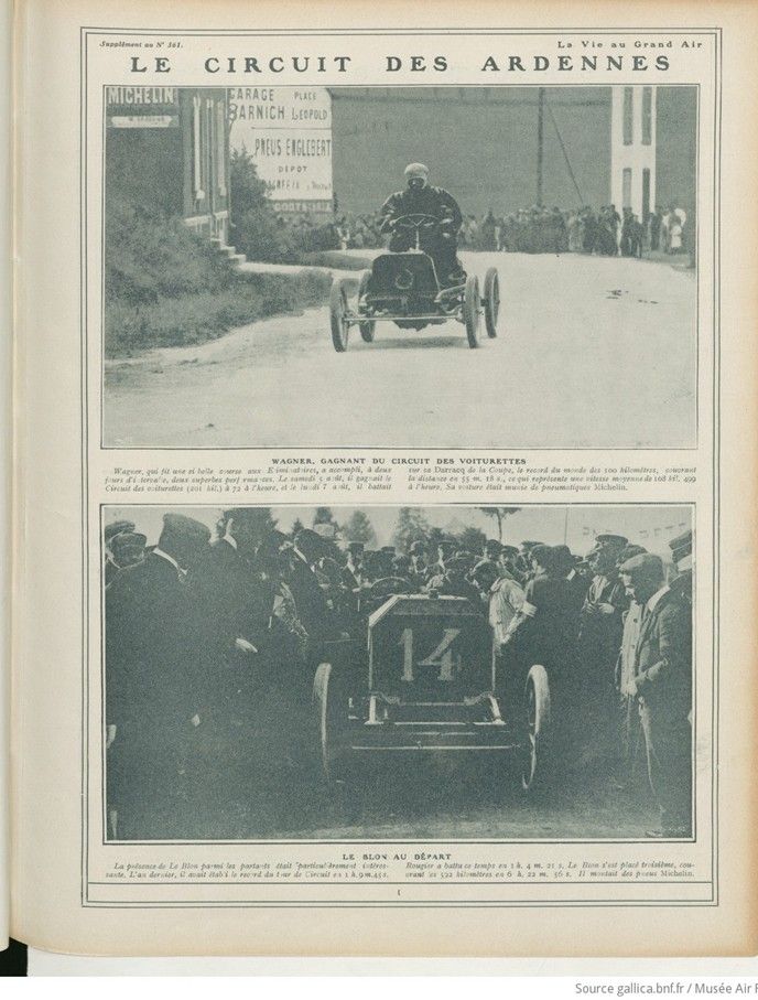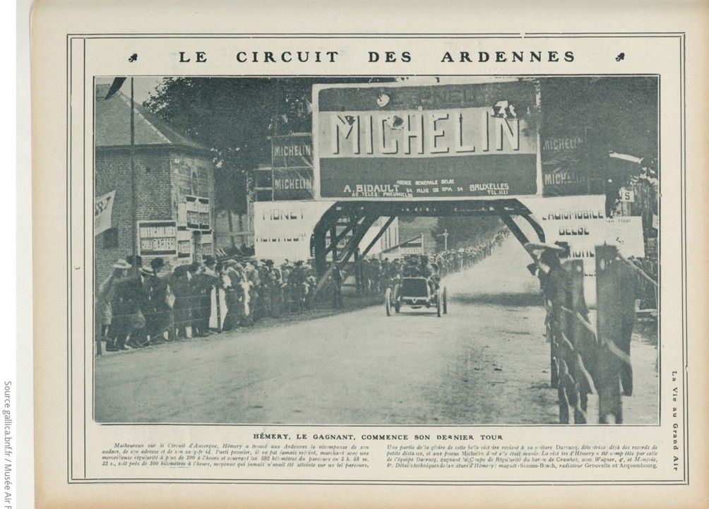 On the long straights of the Circuit des Ardennes, Hémery was able to push his car to its limits. His calculated daring allowed him to navigate the circuit’s few corners at speeds never before seen. His car was equipped with Michelin tires.