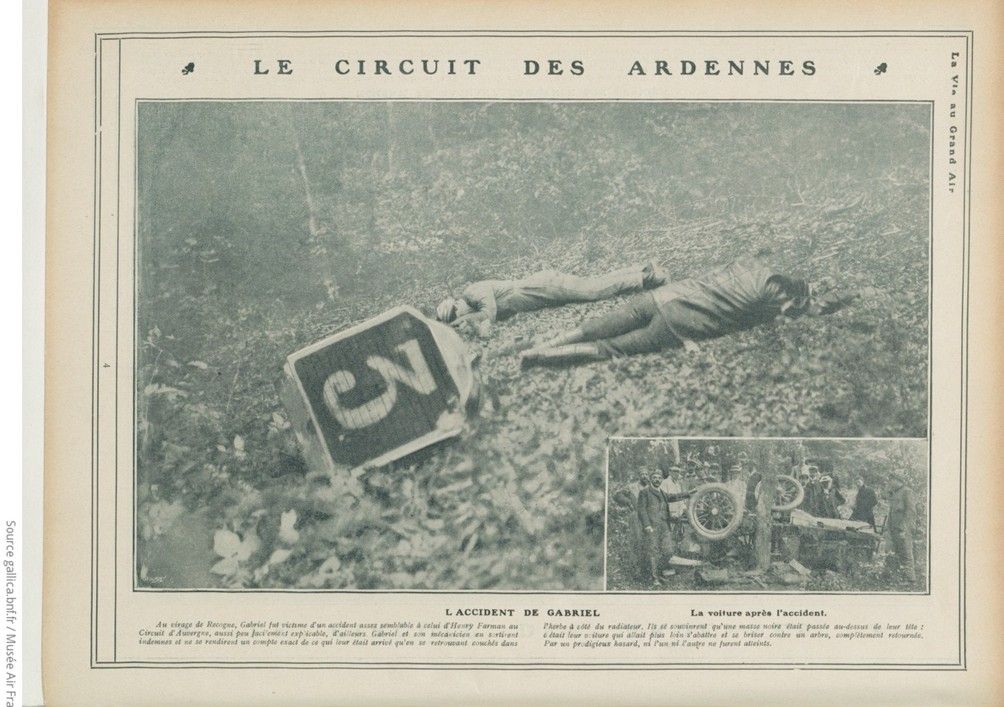 Au virage de Recogne, Gabriel fut victime d’un accident assez semblable à celui d’Henry Farman au Circuit d’Auvergne, aussi peu facilement explicable, d’ailleurs. Gabriel et son mécanicien en sortirent indemnes et ne se rendirent un compte exact de ce qui leur était arrivé qu’en se retrouvant couchés dans l’herbe à côté du radiateur. Ils se souvinrent qu’une masse noire était passée au-dessus de leur tête :
