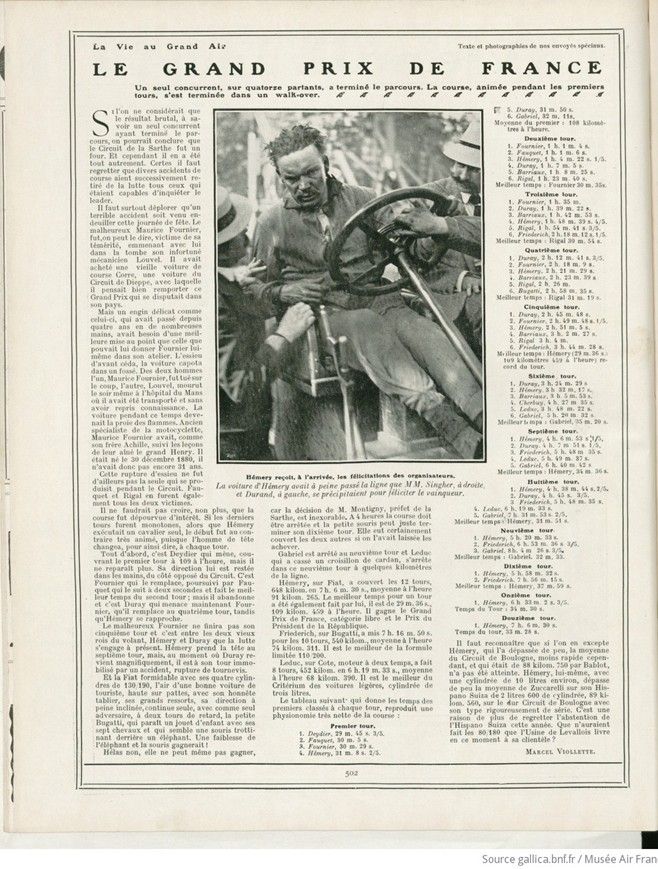 Il faut surtout déplorer qu’un terrible accident soit venu endeuiller cette journée de fête. Le malheureux Maurice Fournier, fut, on peut le dire, victime de sa témérité, emmenant avec lui dans la tombe son infortuné mécanicien Louvel. Il avait acheté une vieille voiture de course Corre, une voiture du Circuit de Dieppe, avec laquelle il pensait bien remporter ce Grand Prix qui se disputait dans son pays.