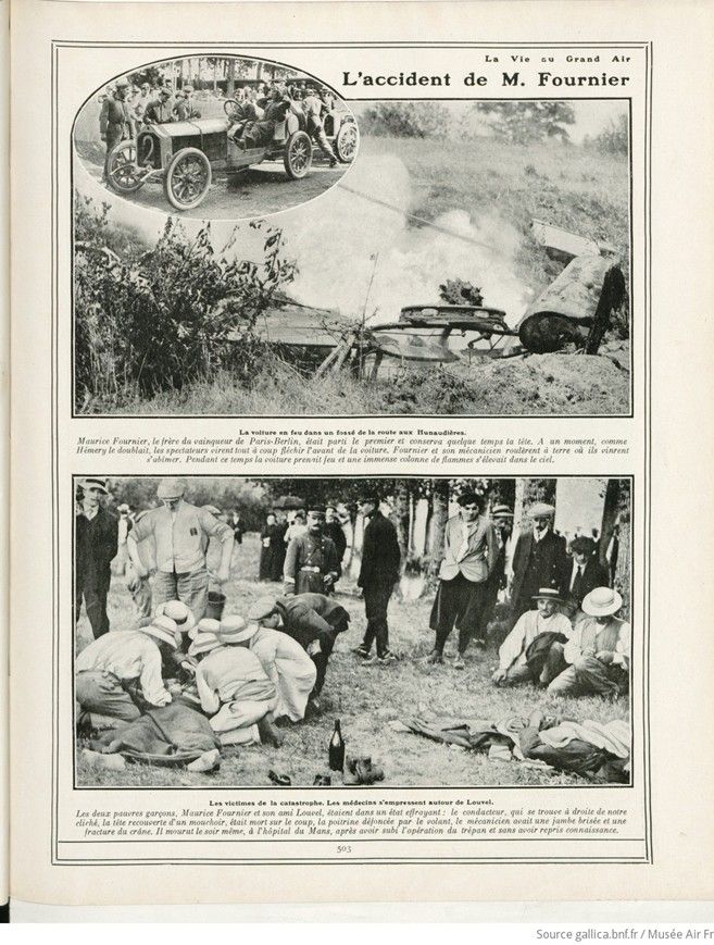 Maurice Fournier, le frère du vainqueur de Paris-Berlin, était parti le premier et conserva quelque temps la tête. A un moment, comme Hémery le doublait, les spectateurs virent tout à coup fléchir l’avant de la voiture. Fournier et son mécanicien roulèrent à terre où ils vinrent s’abîmer. Pendant ce temps la voiture prenait feu et une immense colonne de flammes s’élevait dans le ciel.