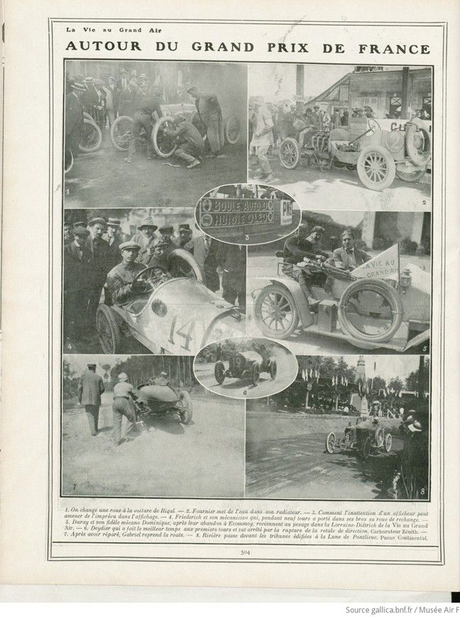 1. On change une roue à la voiture de Rigal. — 2. Fournier met de l’eau dans son radiateur. – 3. Comment l’inattention d’un afficheur peut amener de l’imprévu dans l’affichage. — 4. Friederich et son mécanicien qui, pendant neuf tours a porté dans ses bras sa roue de rechange — 5. Duray et son fidèle mécano Dominique, après leur abandon à Ecommoy, reviennent au pesage dans la Lorraine-Diétrich de la Vie au Grand Air. — 6. Deydier qui a fait le meilleur temps aux premiers tours et fut arrêté par la rupture de la rotule de direction. Carburateur Zéuith. — 7. Après avoir réparé, Gabriel reprend la route. — 8. Rivière passe devant les tribunes édifiées à la Lune de Pontlieue. Pneus Continental.