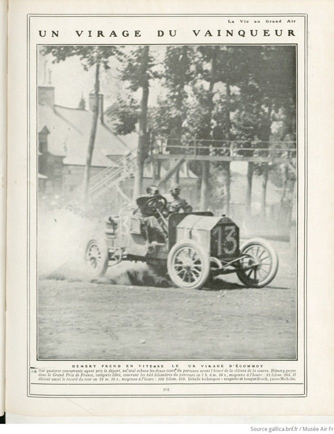 Sur quatorze concurrents ayant pris le départ, un seul acheva les douze tours du parcours avant l’heure de la clôture de la course. Hémery gagne donc le Grand Prix de France, catégorie libre, couvrant les 648 kilomètres du parcours en 7 h. 6 m. 30 s., moyenne à l’heure : 91 kilom. 265. Il détient aussi le record du tour en 29 m. 36 s., moyenne à l’heure : 109 kilom. 459. Détails techniques : magnéto et bougies Bosch, pneus Michelin.