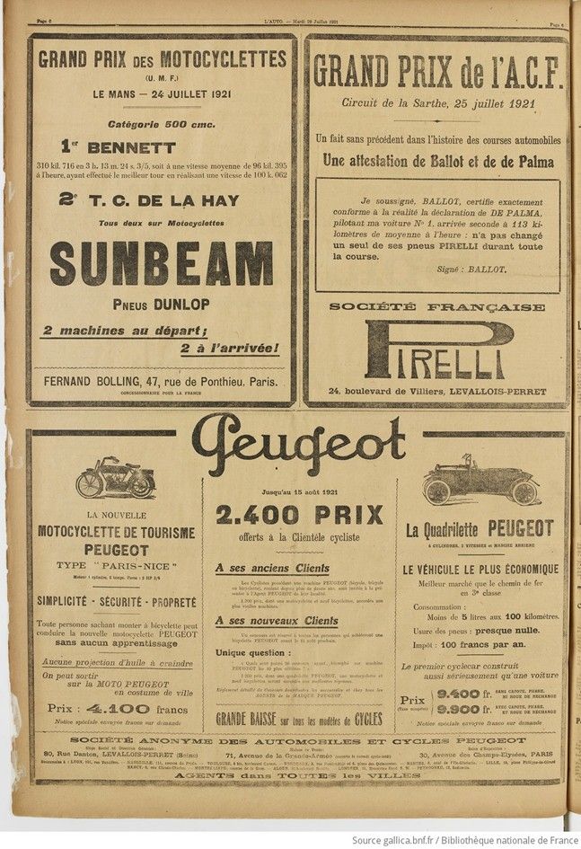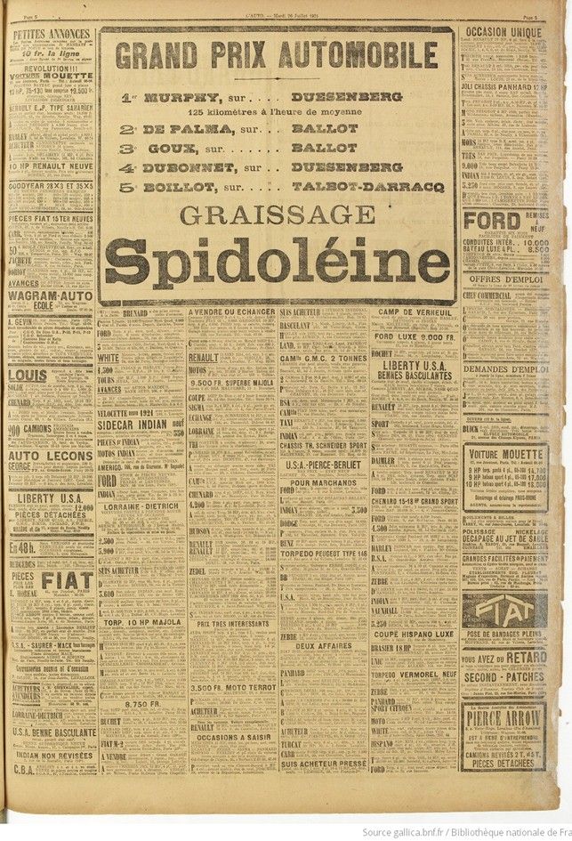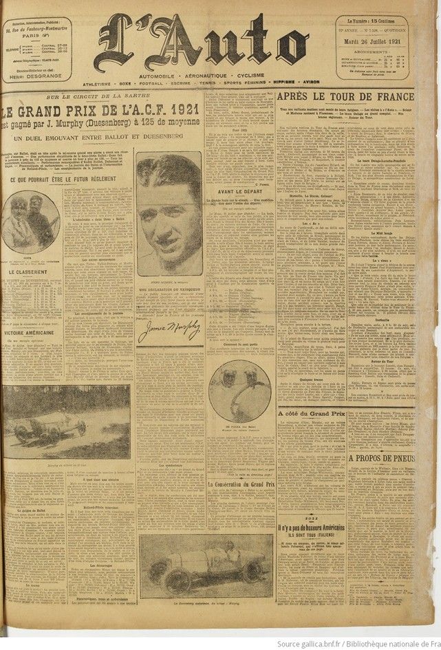 Le Mans, July 25 (by dispatch). — The Grand Prix is over, ending with a decisive victory. Murphy, driving a Duesenberg, which had the longest race among the entrants with its 3-liter engine and was the fastest — at 4,000 revolutions per minute — Murphy, therefore, won at an average speed of over 125, which is simply admirable. In all fairness, there can be no question of quibbling over this fine victory, and justice must be done to the American manufacturers. Thus, we will perhaps continue to bear the burden of a terrible war that has diverted our industries from fruitful endeavors for a long time to come.
