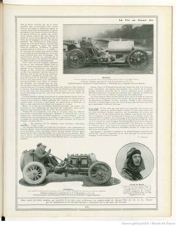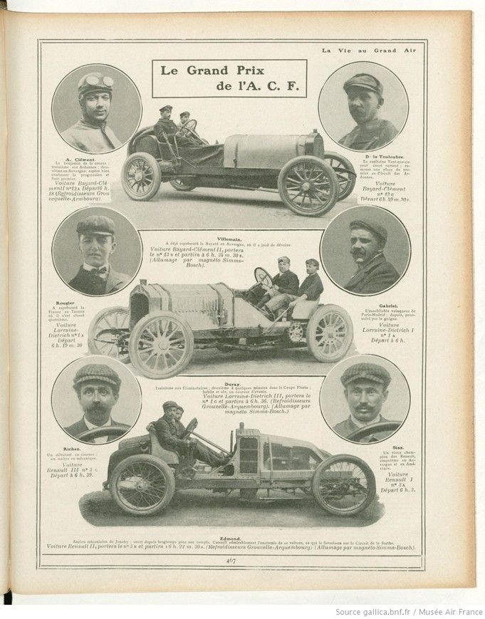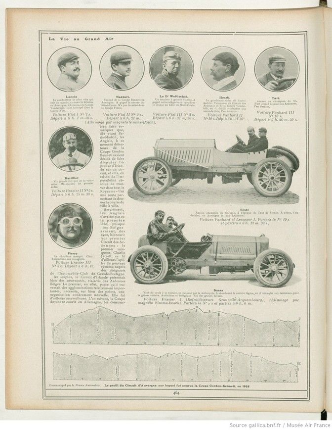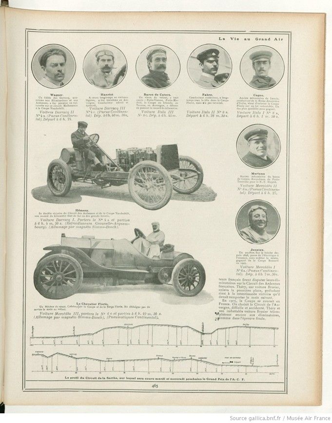 Readers of Vie Au Grand Air will also find photographs of the 13 types of cars and their 34 drivers. We have also previously traced the biographies of the main ones: as far as the cars are concerned, my aim is not to go into the dry details of a purely technical description, but only to explain their main features.