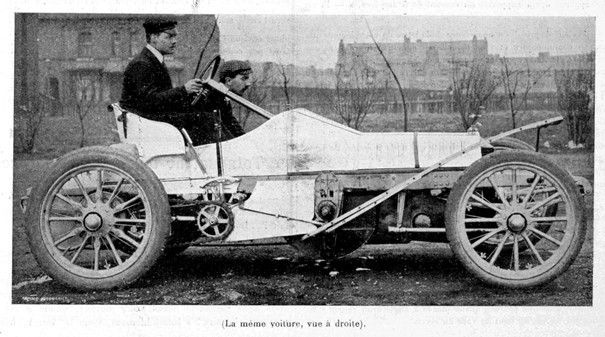 This car, like the Richard-Brasier, has its driver and mechanic seated very far back, with all the controls on that side, but the parts are arranged even lower than in the Richard-Brasier, to such an extent that at high speed there appears to be no gap between the ground and the car.