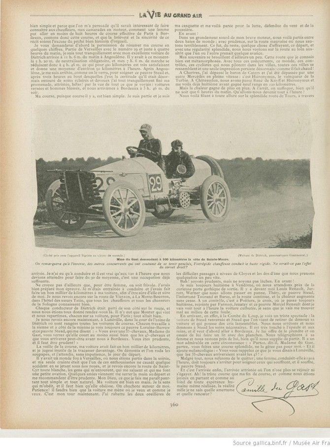 Madame du Gast, the intrepid chauffeur and the only woman who had the audacity to take part in the Paris-Madrid race, steering wheel in hand, kindly wrote the story of her race especially for the readers of La Vie au Grand Air. The impressions of this woman, who has just astonished the sporting world with the courageous struggle she has sustained, were very interesting to learn about and will undoubtedly be highly appreciated. As we know, Mrs. du Gast, while she was in fifth place in the general classification, did not fear to abandon all her chances in the race in order to go several times to the aid of competitors who were victims of accidents. Our photograph shows her in your descent of Ste-Maure, speeding at a rate of well over 700 kilometers per hour. How many women would quiver in the presence of such audacity!