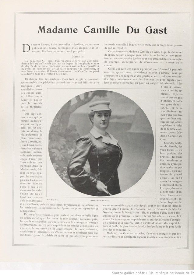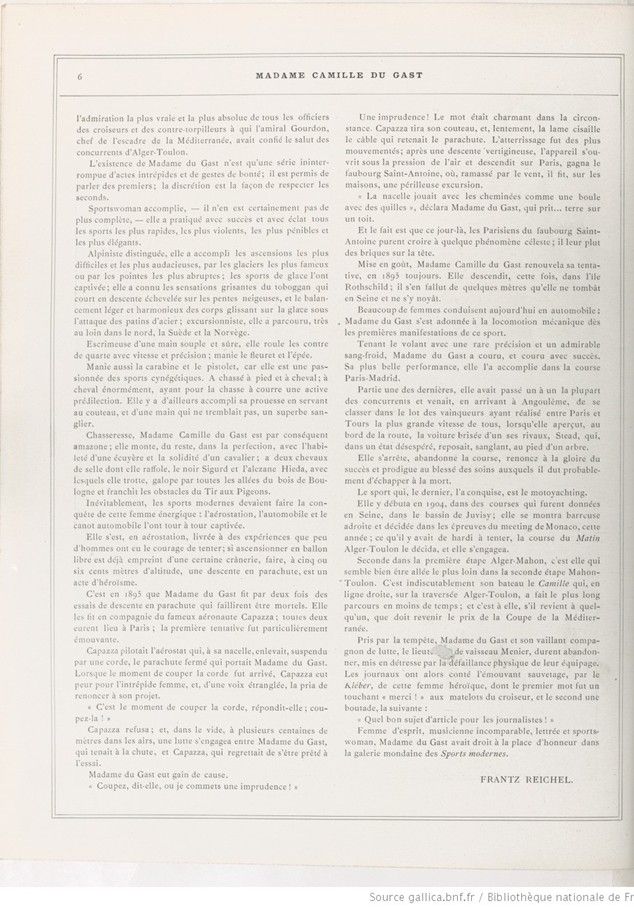Cette femme est Madame Camille du Gast, à qui les hommes de sport, faisant quelque jour trêve à de faciles et mesquines ironies, sauront rendre justice pour ses extraordinaires exemples de courage, d’énergie et de dévouement aux choses qu’ils aiment.