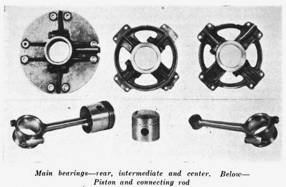 The connecting rods are of chrome-vanadium steel, of tubular section, and are 6 in. long from center to center. The weight of the piston and connecting rod assembly is 23½ oz. Connecting rod bearings are of babbitt, cast without spinning, and the pin bearing is of bronze. The pin rides on the alumnium of the piston.
