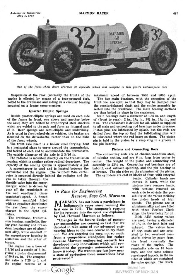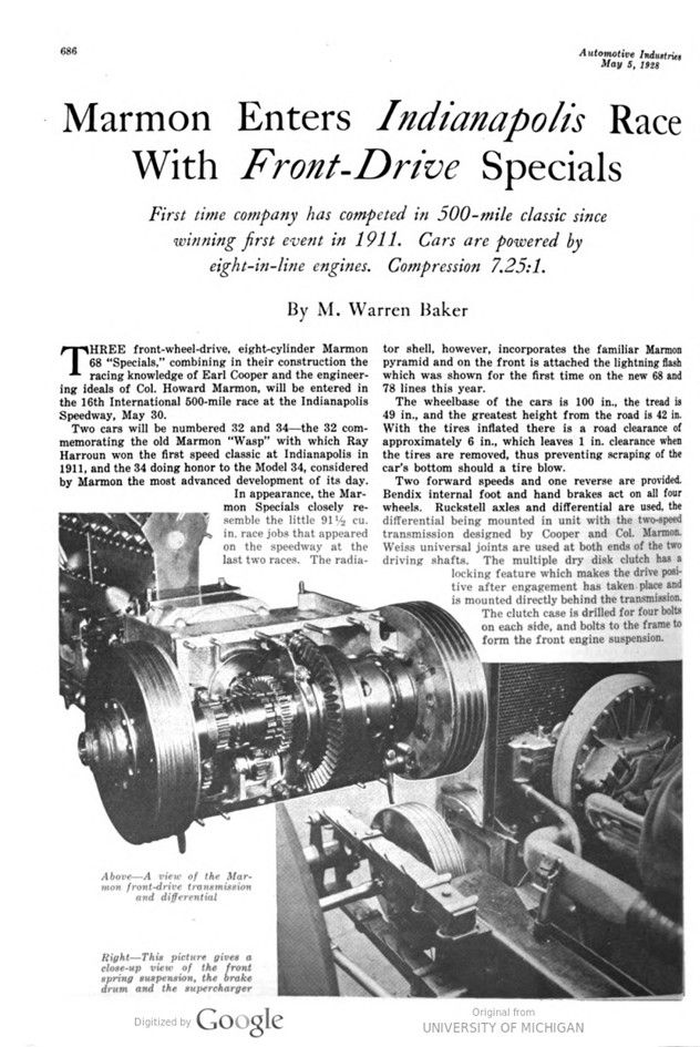 Marmon Enters Indianapolis Race with Front-Drive Specials – Automotive Industries – 5 May 1928