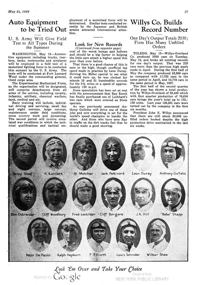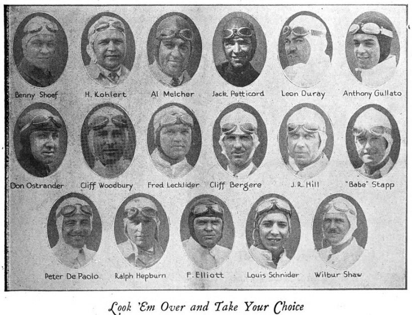 Benny Shoaf – H. Kohlert – Al Melcher – Jack Petticord – Leon Duray – Anthony Gullato Don Ostrander -Cliff Woodbury -Fred Lecklider -Cliff Bergere -J. R. Hill -„Babe“ Stapp Peter De Paolo – Ralph Hepburn – F. Elliott – Louis Schnider – Wilbur Shaw