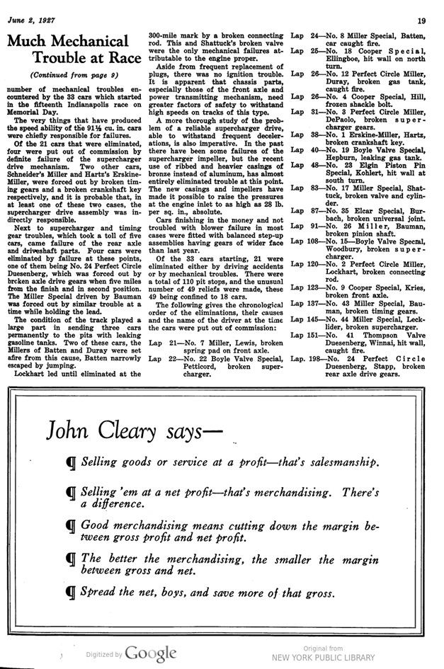 Aside from frequent replacement of plugs, there was no ignition trouble. Lap It is apparent that chassis parts, especially those of the front axle and power transmitting mechanism, need Lap greater factors of safety to withstand high speeds on tracks of this type.
