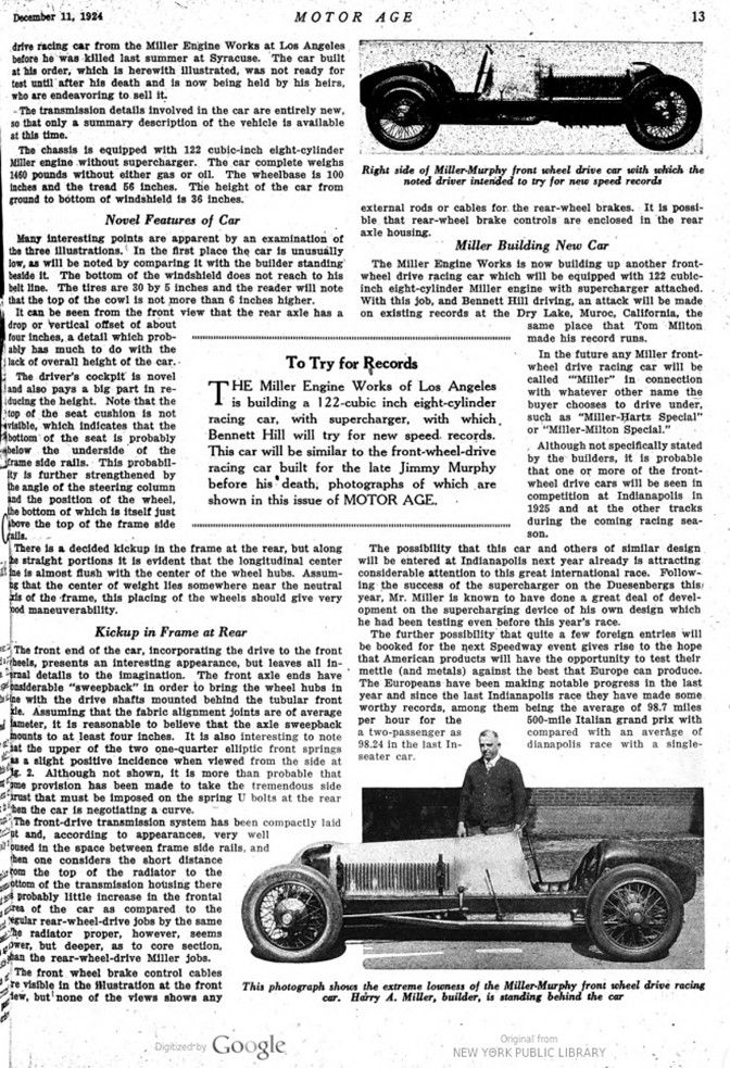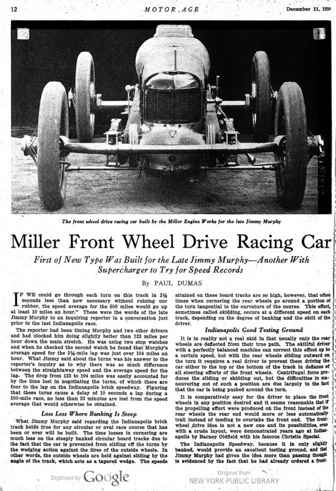 This article, written by the French journalist Paul Dumas, described the Miller 91 front wheel drive of 1924. This car was based on the idea and a request of Jimmy Murphy, who perished that year.
