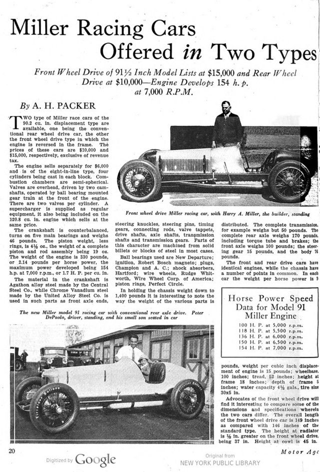 In 1926, the Miller Cars already were that successfull, that two types could bw bought at the Miller Company; a front-wheel drive and a rear-wheel driven version. Both cars had the same engine; whereas the front-wheel drive car had the engine assembled in reverse.