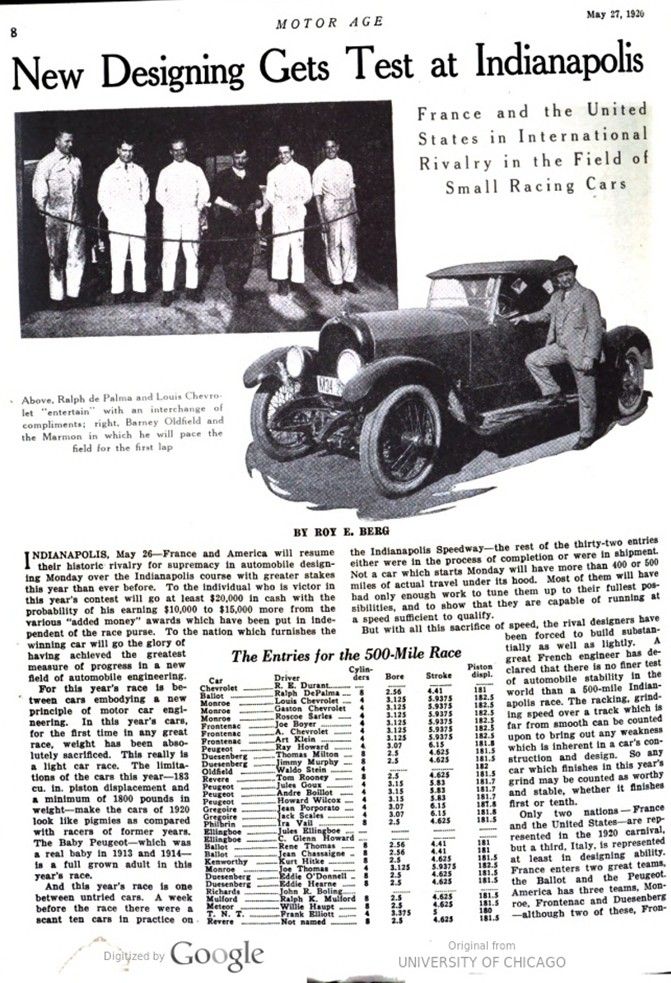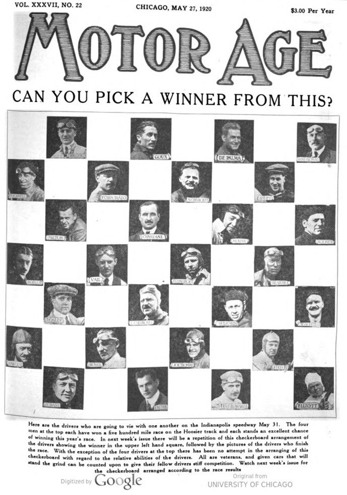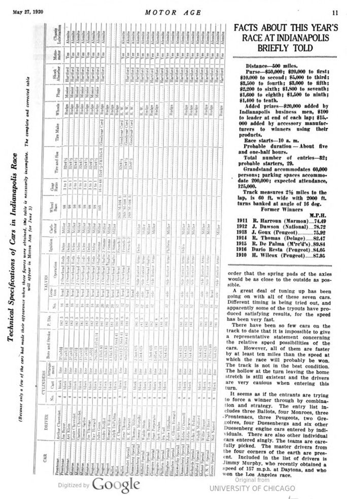 Motor Age, Vol. XXXVII, No. 22, May 27, 1920, page 7 – 13 / In This Issue: Indianapolis Race Entries