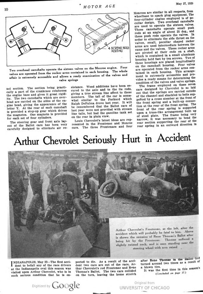 Arthur Chevrolet’s Frontenac, at the left, after the accident which will probably be fatal to him. Above is shown the remains of Rene Thomas’s Ballot after being hit by the Frontenac. Thomas suffered a slightly twisted neck, and is seen standing near the steering wheel with arm raised.