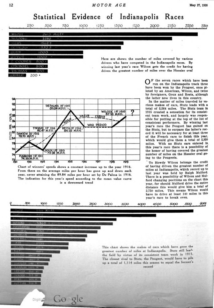 In the matter of miles traveled by various makes of cars, Stutz leads with a total of 5,564 miles. The Stutz team in 1915 created a sensation for its consistent team work, and largely was responsible for putting at the top of the list of consistent performers. By winning last year’s race the Peugeot has gained on the Stutz, but to surpass the latter’s record it will be necessary for at least three of the French cars to finish this year, which would give them a total of 5,950 miles. With no Stutz cars entered in this year’s race there is a possibility of the honor of having covered the greatest number of miles on the Hoosier oval going to the Peugeots.