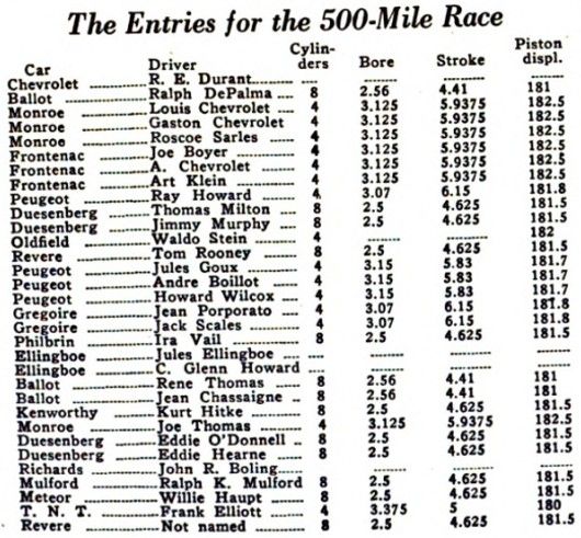 O’DONNELL – MILTON – WILCOX – BOILLOT – VAIL – SCALES – PORPORATO – GOUX – DE PALMA – CHASSANGE – L. CHEVROLET – A. CHEVROLET – HAUPT – ELLINGBOE – JOE THOMAS – SARLES – BOYER – A. MURPHY –  HEARNE – RENE THOMAS – MULFORD – CHEVROLET – STEIN – ROONEY – DURANT – HITKE – FRAY – HOWARD -ELLIOTT