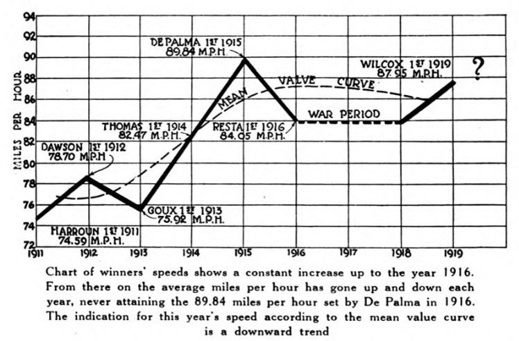 Chart of winners‘ speeds shows a constant increase up to the year 1916. From there on the average miles per hour has gone up and down each year, never attaining the 89.84 miles per hour set by De Palma in 1916. The indication for this year’s speed according to the mean value curve is a downward trend