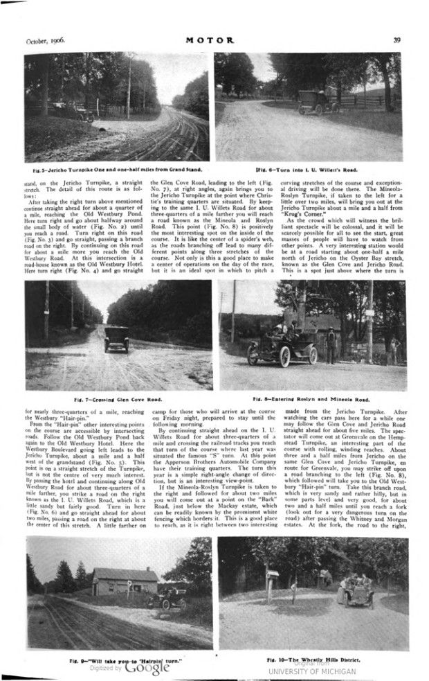 The course selected ran along the Jericho Turnpike from the neighborhood of Westbury, where the grandstand and start was, to Jericho corner, where it turned to the right, passing through Hicksville to a very ugly turn at Plainedge, where it again turned to the right, passing through Hempstead to Queens corner, and another turn to the right into the Jericho Turnpike, and to the start at Westbury. The distance of the course was approximately thirty miles, which necessitated the cars making ten circuits in order to complete the necessary three hundred miles.