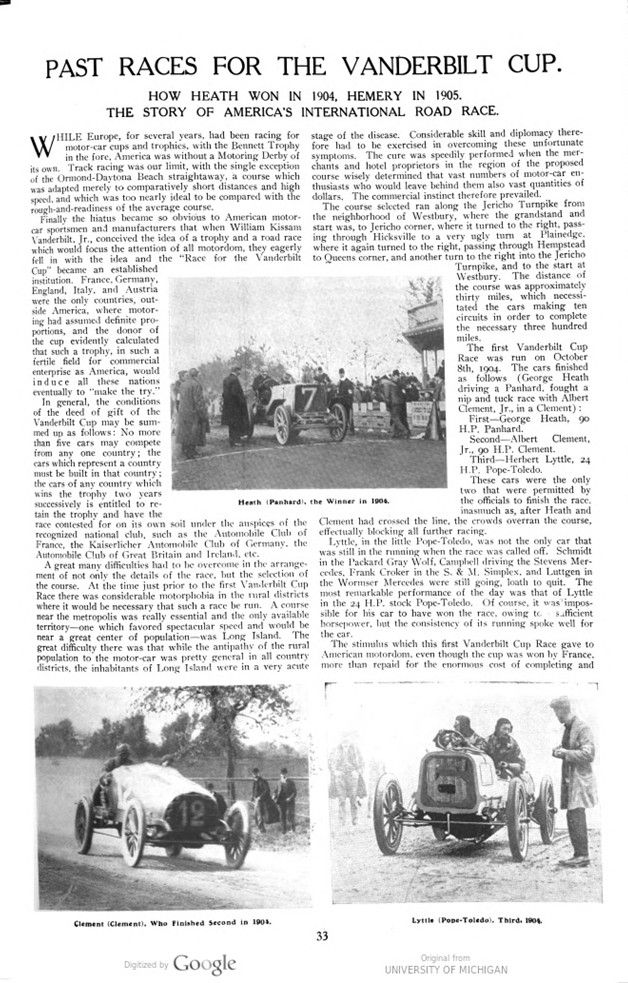 The first Vanderbilt Cup Race was on October 8th, 1904. The cars finished as follows (George Heath driving a Panhard, fought a nip and tuck race with Albert Clement, Jr., in a Clement):