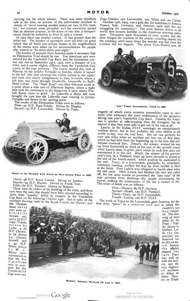 Page 34. 11 – Heath in the Panhard with which he Won Second Place in 1905. / 5 – „Joe“ Tracy (Locomobile), Third in 1905. / Hemery (Darracq) Winning the Cup in 1905.