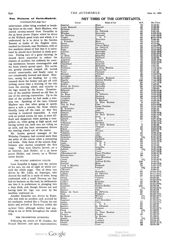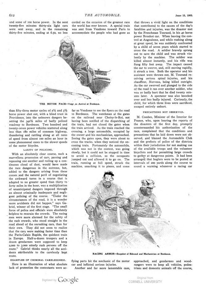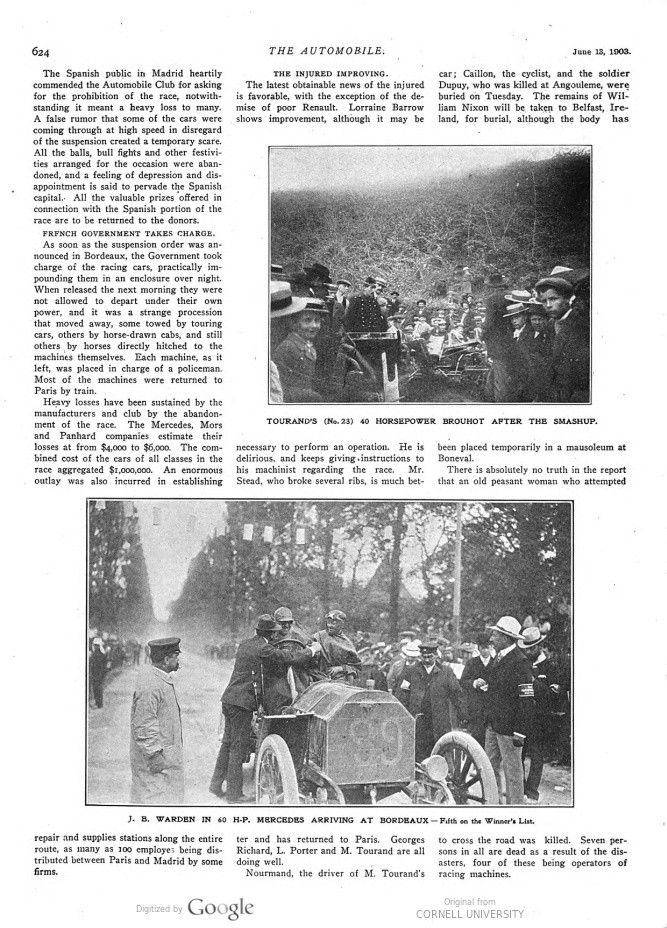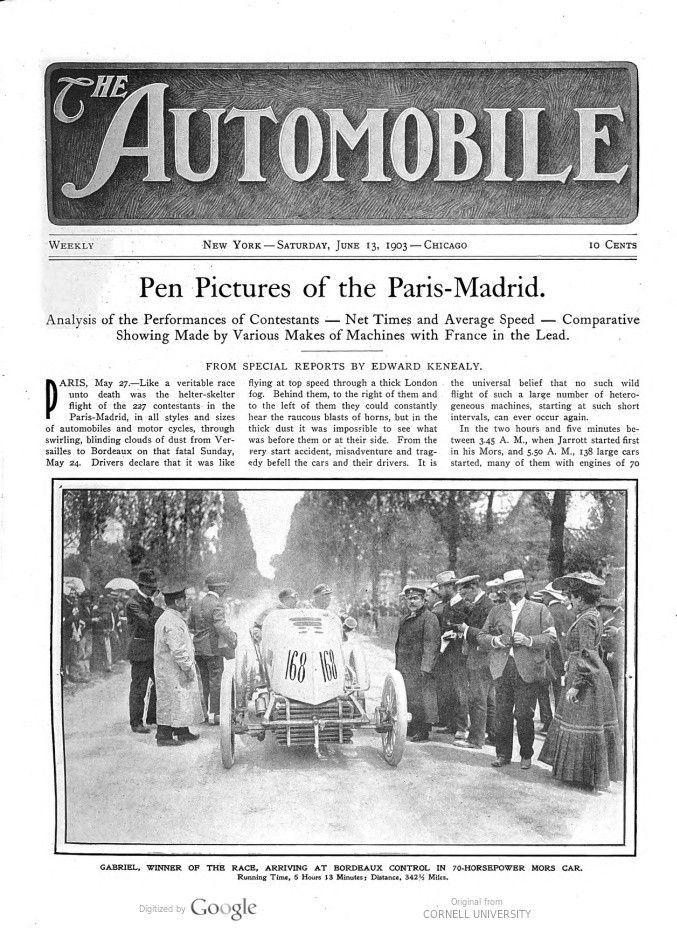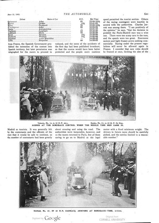 This 1903 Paris-Madrid report of The Automobile, titled „Pen Pictures of the Paris-Madrid“ talks about a „helter-skelter flight“, which thus really was. Expressions like „Laxity of Policing“, „Criminal Carelessness“ and „Precautions not observed“ say it all, with a relveiving „Injured improving“ in the final part of the report. It covers many aspects of this catastophical race. It lasted only one day and that was more than enough!