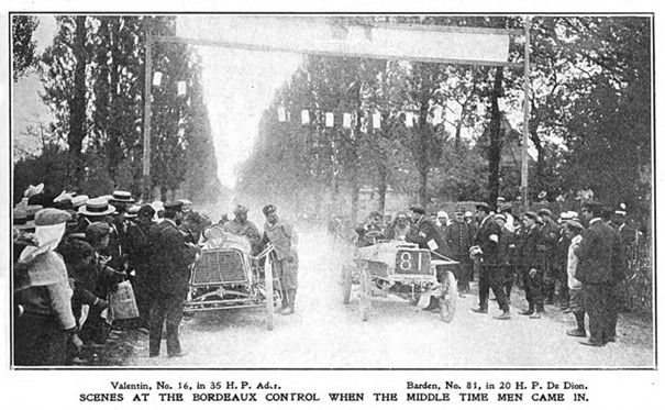 In the two hours and five minutes between 3.45 A. M., when Jarrott started first in his Mors, and 5.50 A. M., 138 large cars started, many of them with engines of 70- and some of 100-horsepower. In the next twenty-five minutes thirty-six light cars were sent away, and in the remaining thirty-five minutes, ending at 6.50, no less than fifty-three motorcycles of 2½ and 3½ horsepower shot out, with a blind trust in Providence, into the unknown dangers besetting the 342½ miles of badly policed roadway to Bordeaux. Two hundred and twenty-seven power vehicles scattered along less than 180 miles of common highway, thundering and rattling along at all rates of speed from almost 100 miles an hour in some phenomenal cases to the slower speeds of the motor bicycles.