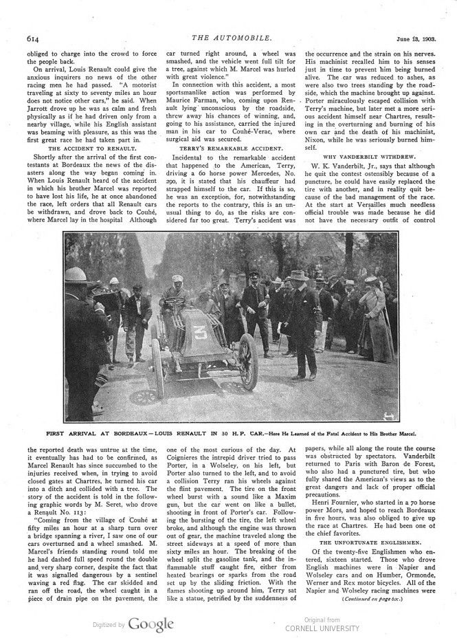 Shortly after the arrival of the first contestants at Bordeaux the news of the disasters along the way began coming in. When Louis Renault heard of the accident in which his brother Marcel was reported to have lost his life, he at once abandoned the race, left orders that all Renault cars be withdrawn, and drove back to Couhé, where Marcel lay in the hospital. Although the reported death was untrue at the time, it eventually has had to be confirmed, as Marcel Renault has since succumbed to the injuries received when, in trying to avoid closed gates at Chartres, he turned his car into a ditch and collided with a tree. The story of the accident is told in the following graphic words by M. Seret, who drove a Renault No. 113: