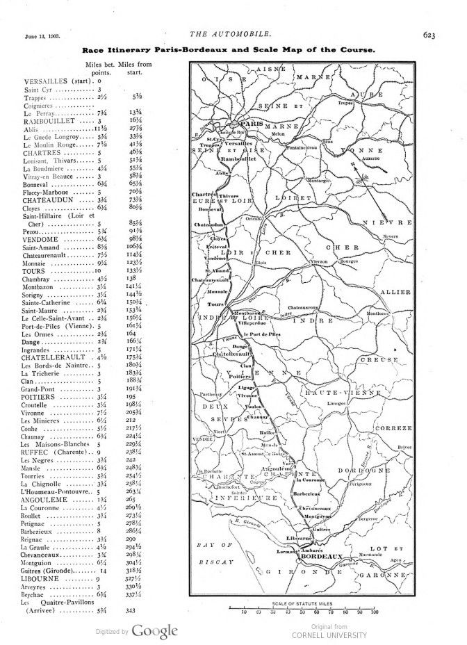 Race Itinerary Paris-Bordeaux and Scale Map of the Course. (Miles bet. points – Miles from start.)