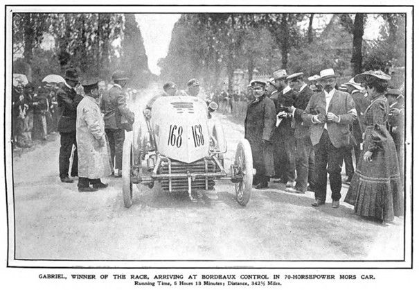 GABRIEL, WINNER OF THE RACE, ARRIVING AT BORDEAUX CONTROL IN 70-HORSEPOWER MORS CAR. Running Time, 5 Hours 13 Minutes; Distance, 342½ Miles. #168.