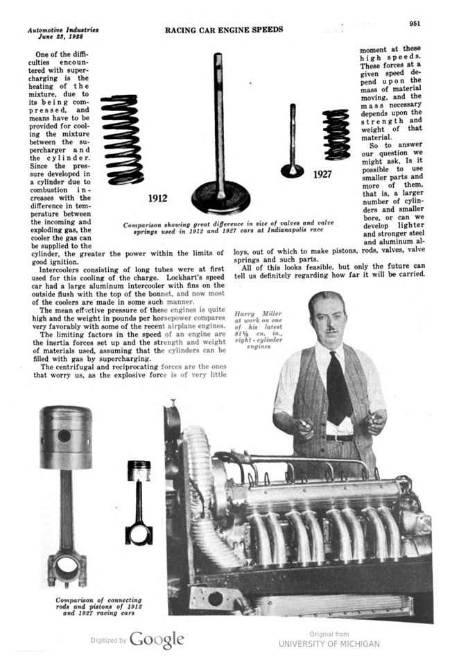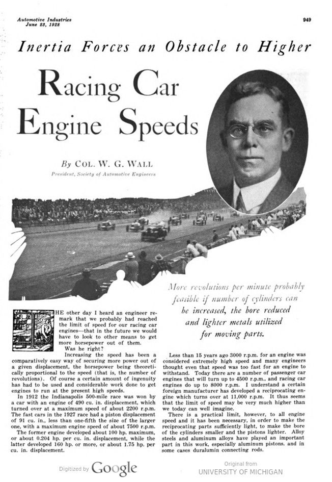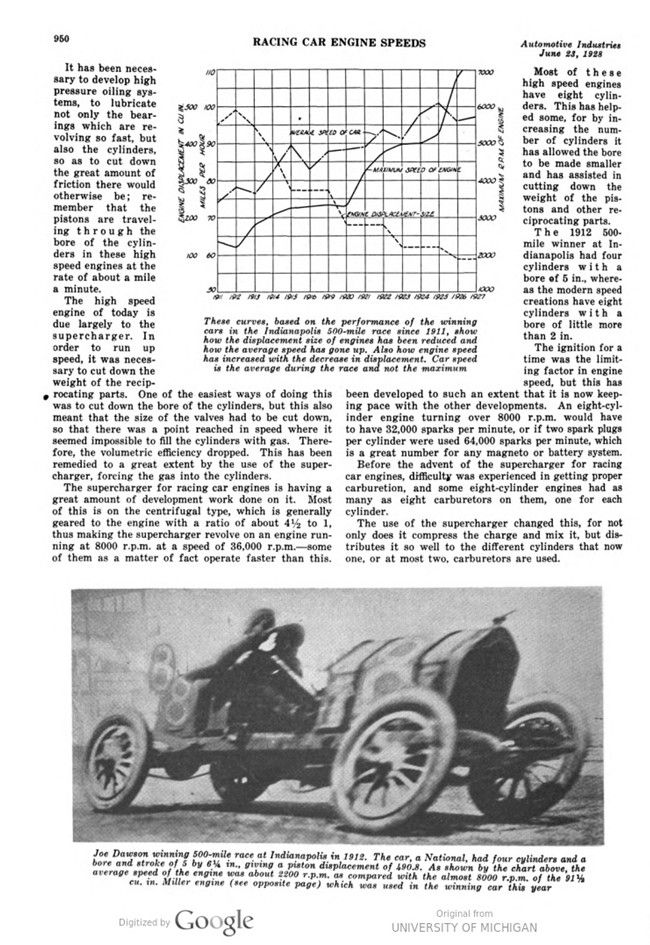 In 1912 the Indianapolis 500-mile race was won by a car with an engine of 490 cu. in. displacement, which turned over at a maximum speed of about 2200 r.p.m. The fast cars in the 1927 race had a piston displacement of 91 cu. in., less than one-fifth the size of the larger one, with a maximum engine speed of about 7500 r.p.m.