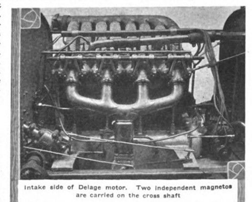 Intake side of Delage motor. Two independent magnetos are carried on the cross shaft