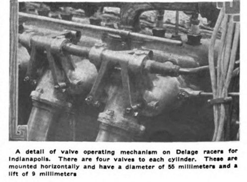A detail of valve operating mechanism on Delage racers for Indianapolis. There are four valves to each cylinder. These are mounted horizontally and have a diameter of 55 millimeters and a lift of 9 millimeters