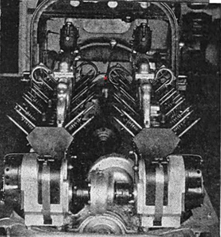 The Sampson Special has a bore and stroke of 2 5/16 by 3, resulting in a displacement of 201 cu. in. Two parallel banks of eight cylinders each, with individual crankshafts, placed 12 in. apart, rotate in a common crankcase. Five main bearings are provided for each shaft. A spur gear, mounted on the front end of each crankshaft, meshes with a gear on the end of a hollow ground shaft 26 in. long, which passes between the cylinder blocks to the driving member of the clutch. As the engines rotate in a counter-clockwise direction, the driveshaft rotates clockwise.