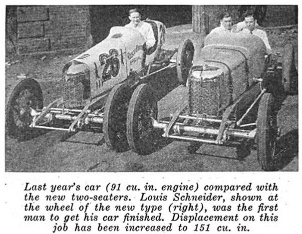 Last year’s car (91 cu. in. engine) compared with the new two-seaters. Louis Schneider, shown at the wheel of the new type (right), was the first man to get his car finished. Displacement on this job has been increased to 151 cu. in.