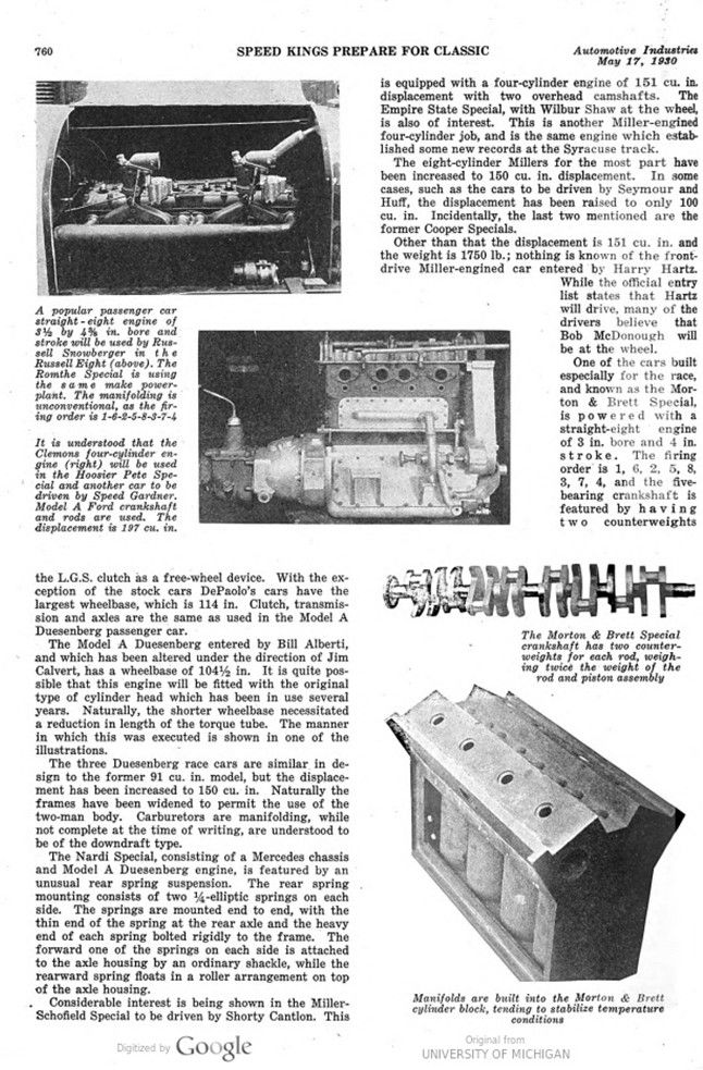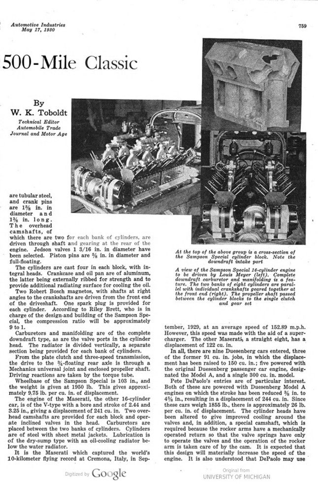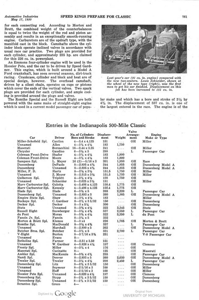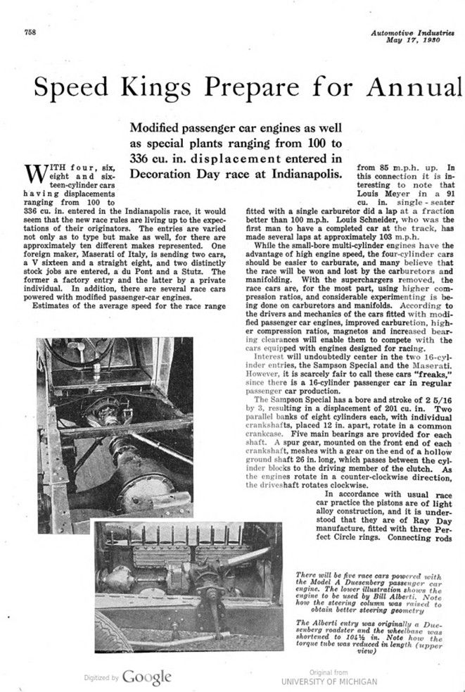 In this aritcle, some the most interesting cars and engines of the 1930 Indianapolis 500 are briefly highlighted. As a result of the new rules, many different cars and their variants were possible; particularly the stock cars. The two 16-cylinder cars; the V16 Maserati with 241 cu. in; as well as the Sampson Special with a 201 cu. in. engine of 2 parallel 8-cylinder banks. The Model A Duesenberg, the Miller-Scofield Special and more Specials.