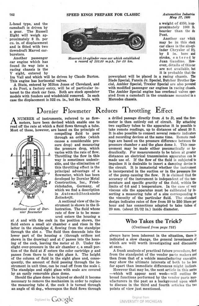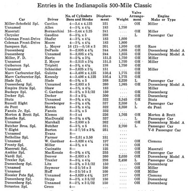 Entries in the Indianapolis 500-Mile Classic (table)Page 762. Maserati 16-cylinder race car which established a record of 152.89 m.p.h. for 10 km.