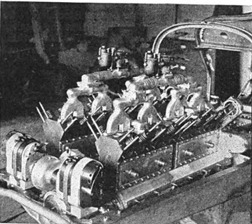 In accordance with usual race car practice the pistons are of light alloy construction, and it is understood that they are of Ray Day manufacture, fitted with three Perfect Circle rings. Connecting rods are tubular steel, and crank pins are 1 5/8 in. in diameter and 1 3/8 in. long. The overhead camshafts, of which there are two for each bank of cylinders, are driven through shaft and gearing at the rear of the engine. Jedson valves 1 3/16 in. in diameter have been selected. Piston pins are 5/8 in. in diameter and full-floating.